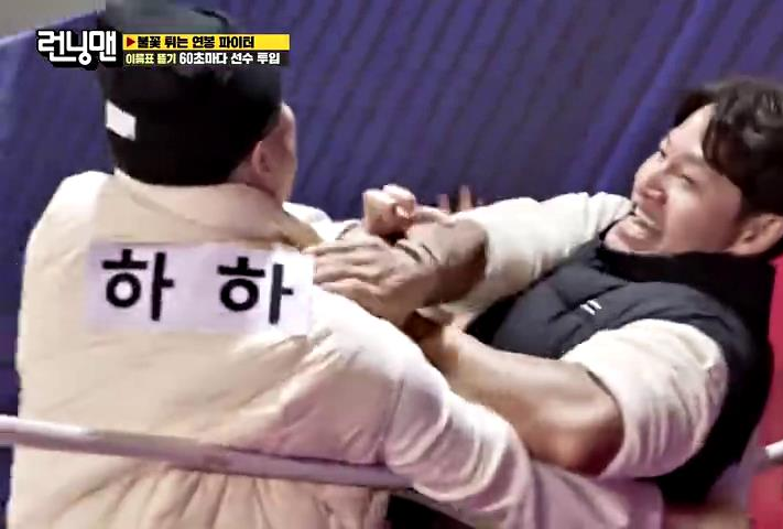 这样三轮下来,轮到金钟国登场,他面对的就是刘在石、郑赞成和哈哈三人的围攻。已经很久没见过金钟国一对三了,看到这一幕还挺激动。
