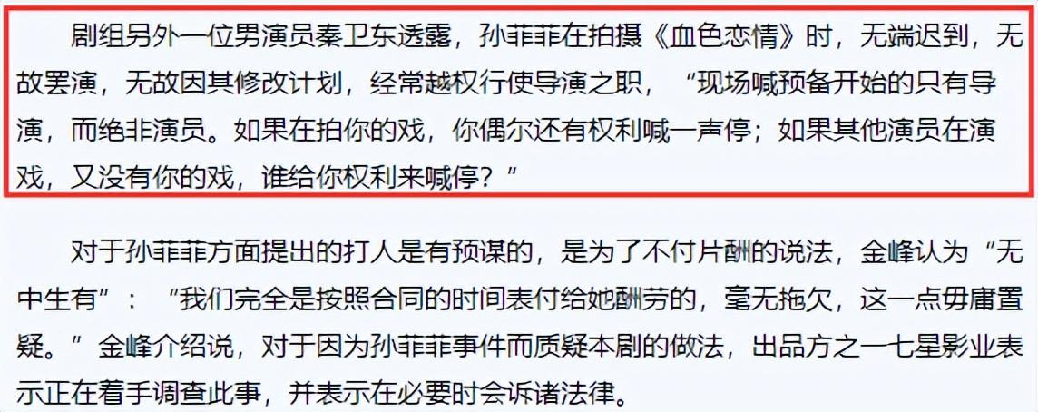 而剧组里的人称孙菲菲连续几天迟到、耍大牌、罢演、有越界行为等。